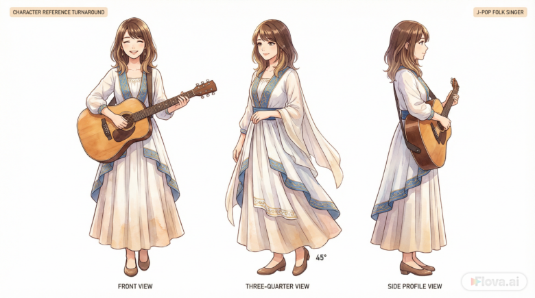 - スタイル提案: プロンプトでは、キャラクターの詳細を明確に定義するために、「三面図」または「キャラクターシート」(Three-view / Character Sheet)スタイルを指定することが理想的です。