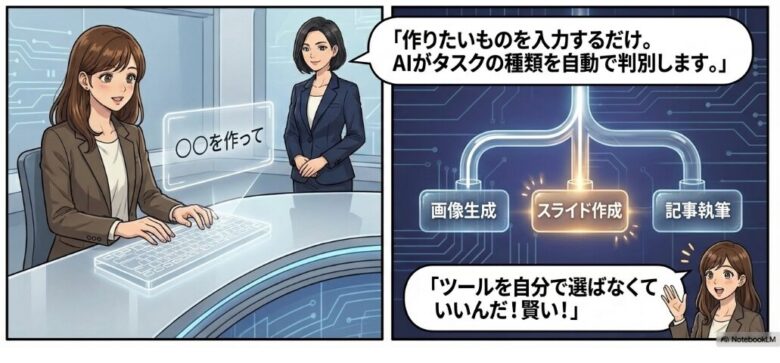 • タスクの自動判別: リサーチ、執筆、PPT作成、画像・動画生成など、何が必要かを判断。